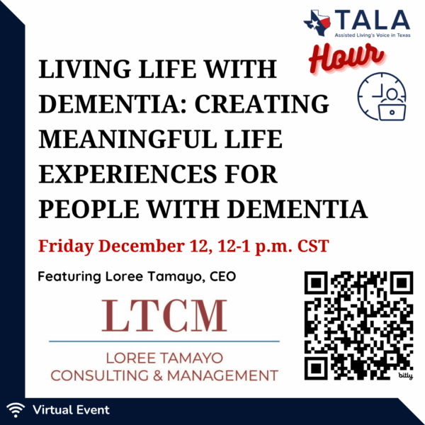 The Texas Assisted Living Association (TALA) is dedicated to advancing the Assisted Living industry primarily through advocacy, education, and workforce development resources and information for employees and communities. To learn more, go to about TALA.